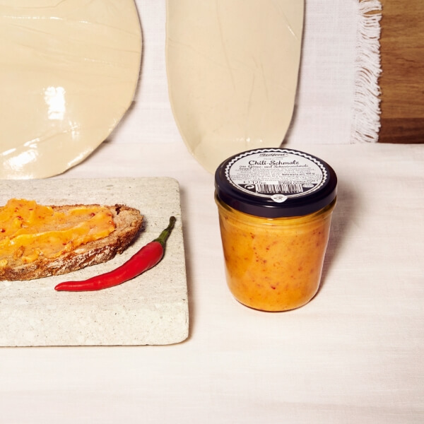 aus Gänse- und Schweineschmalz Aus feinstem Gänseschmalz, frischem Schweineschmalz mit Grieben, scharf mit Chili gewürzt, mit knackigen Röstzwiebeln zu einem feurigen, streichfähigen Brotaufstrich zusammengestellt.