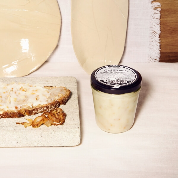 aus Gänse- und Schweineschmalz Aus feinstem Gänseschmalz, frischem Schweineschmalz mit Grieben, mit reichlich Röstzwiebeln und Gewürzen zu einem deftigen, streichfähigen Brotaufstrich zusammengestellt.