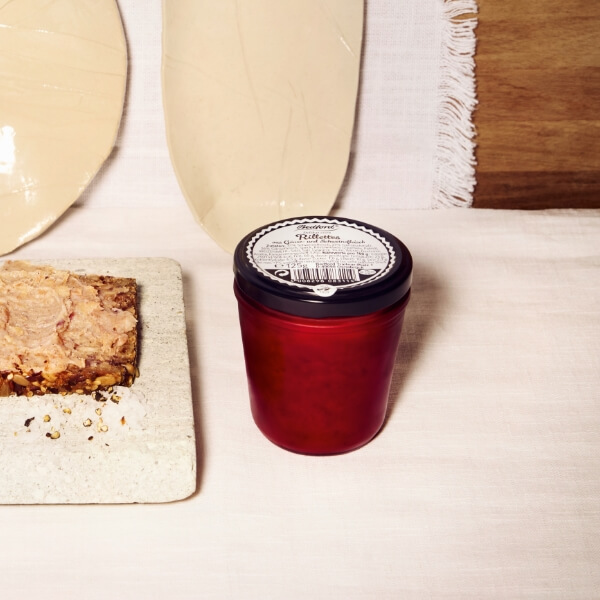 aus Schweinefleisch, mit Whiskey Mageres Schweinefleisch wird schonend in Schweineschmalz ausgebraten und mit Zwiebeln und Bourbon-Whiskey abgeschmeckt. In Gläser abgefüllt. Der Geschmack ist süß-aromatisch.